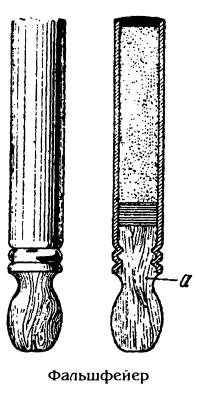 Фальшфейер представляет собой тонкостенную бумажную гильзу, как и фигурная свеча, но только большего размера, с деревянной ручкой а с одного конца. Гильза набивается медленно горящим составом бенгальского огня; служит для освещения местности и различных предметов. Ручка предназначается для держания фальшфейера в руках или для прикрепления его.