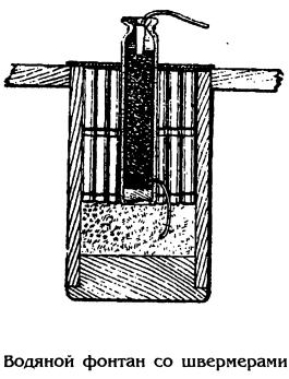 Для устройства фонтана скатывают из картона бурачную гильзу диаметром около 20 см, длиной 30 см и с толщиной стенок около 7 мм. К одному концу этой гильзы прикрепляют деревянное или картонное дно, а затем полученный бурак как снаружи, так и внутри тщательно покрывают смолой. Бурак снаряжают швермерами или пчелками, между которыми устанавливают хорошо набитый фонтан калибром 30 мм. Сверху бурак заклеивают тонким мягким хорошо просмоленным картоном. Для спуска бурака изготовляют из толстых досок плотик, имеющий вид круга с диаметром около 1 м. В центре плотика делают круглое отверстие диаметром около 21 см. Этим отверстием насаживают плотик на верхний конец бурака, скрепляют их между собой расплавленной смолой или прибивают медными гвоздями. Запальный привод присоединяется к шейке фонтана. Для воспламенения вышибного заряда привод одним концом прикоммуниковывается к нижнему передаточному отверстию фонтана, а другим соединяется с пороховым зарядом.