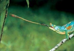 Язык хамелеона представляет собой искусный ловчий аппарат с липким капканом в виде расширенного железистого поля на конце.