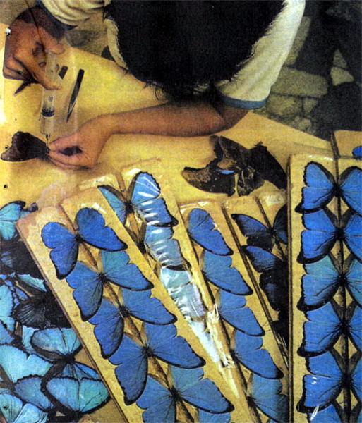 В Малайзии и Таиланде лавочки китайцев, торгующих бабочками, как правило, стоят на проезжих дорогах. В витринах выставлен товар — блюдца, вазочки, .пепельницы, на донышках которых в остекленевшей акриловой массе лежат бабочки всевозможной величины, расцветки и стоимости. Но в какой восторг можно прийти, если упросить хозяина магазинчика показать внутреннее помещение лавочки, где полки уставлены сотнями коробочек, из которых раздается легкое шуршание, или заглянуть в огромные планшеты и кляссеры с крупными экземплярами! Здесь же, за столом, сидит в марлевой повязке жена хозяина и с помощью обыкновенного шприца и иглы впрыскивает в основания крылышек препарированных мотыльков теплую воду, а потом ловко прикалывает их к бальсовым планкам с вырезанными вдоль по центру канавками для бумажных туловищ. Теплая вода оживляет цвета в мертвом крыле, а бумажное туловище не разлагается.