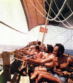 Наливая в кружку масла, чтобы смазать им кожаный ремень, которым крепилось одно из рулевых весел, я думал о том, какая пестрая команда собралась на борту «Арго». С Назымом я познакомился в Бахрейне, где он работал фотографом в министерстве информации. Джона мне порекомендовал как великого любителя морских путешествий врач, ходивший со мной на «Арго» в прошлом году. Американец Рик отыскал меня осенью прошлого года, когда я был гостем Национального географического общества в Вашингтоне, и попросил взять его простым матросом. Услышав, что прежде он был вертолетчиком, я удивился, не очень хорошо представляя себе, как такая квалификация может пригодиться на борту галеры бронзового века. Однако я зря беспокоился. Рик оказался мастером на все руки: он одинаково умело справлялся и с плотницкой работой, и с различными снастями, и с надувной лодкой, когда нужно было что-то фотографировать, а Назым, сидя в ней со своими камерами, вертел головой над бортом, словно любопытная белка.