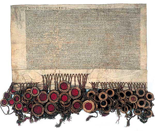 Дальше — больше: Городельская уния в 1413 году уже фиксировала неразрывный союз обеих монархий, подтверждала привилегированный статус католиков и провозглашала создание в Литве нового привилегированного сословия — шляхты, по польскому образцу. А чтобы окончательно слить воедино дворянство двух государств, 47 знатных семейств Польши поделились своими гербами с таким же числом благородных домов Великого княжества. Впрочем, гарантии независимости литовско-русское государство сохранило: «родственникам» с запада запрещалось занимать управляющие должности и даже селиться в нем.