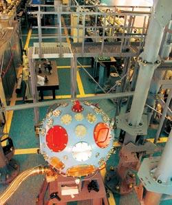 Взрывная камера создаваемой в России установки инерционного термоядерного синтеза «ИСКРА-6». Со всех сторон в камеру будет вводиться 128 лучей, генерируемых фиолетовым лазером на стекле с неодимом. Импульс длительностью 3 нс будет нести энергию 300 кДж, длина волны лазера — 350 нм. На сегодня уже построены и используются в экспериментах четыре лазерных канала (установка «Луч») с энергией в импульсе 12 кДж. Фото: SPL/EAST NEWS