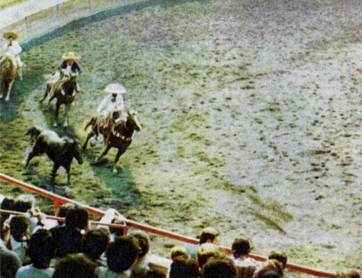 ...Дорога к истине вела в сельскую местность. Здесь по воскресным дням, а чаще в праздники организуются красочные, типично мексиканские представления — «чарреады». На круглых аренах, значительно больших, чем цирковые, парни и девушки демонстрируют искусство конной езды. Мужчины, помимо этого, соревнуются в метании лассо, в укрощении упрямых жеребцов и буйных бычков. Зрелище перемежается выступлениями народных певцов — марьячи.