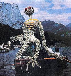 Древние славяне, правда, сжигали соломенное чучело — Зиму, а в Штирии чучело делают из цветов. И не одно, а два, соединенных рука об руку. Это супружеская пара Мэннэрль — Человечек и Вэйбль — его Женушка. Кроме того, их не сжигают, а топят в озере Аусзее. Тому есть объяснение, как считают здесь, вполне достоверное. В незапамятные времена в озере жил, мол, дракон, которого ежегодно ублажали жертвой — самой красивой девушкой. Это предание до мелочей соответствует фактам из быта драконов, широко известным по всей Европе. Но раз случилось иначе. Родители, чья единственная дочь-красавица предназначалась чудищу, взмолились и предложили себя в жертву. Здешний дракон расчувствовался, навсегда отказался от своих прежних скверных привычек и, очевидно, почувствовав тягу к прекрасному, потребовал подносить ему впредь цветы. Но из цветов надлежало делать все-таки человеческие фигуры. Наверное, потому, что другие драконы Центральной Европы, узнав, что их аусзейский коллега совсем отказался от жертв, могли бы его неправильно понять. А с мнением собратьев дракон из Аусзее все-таки считался.