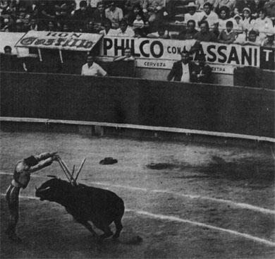...Маноло Мартинес любил праздники, на которых «чаррос» — мексиканские ковбои — демонстрировали свое мастерство объездчиков. Они способны на полном скаку схватить корову за хвост и свалить ее на землю или отделить животное от стада, набросив лассо. Спешившись и взяв в руки мулету, чаррос выстоят и против норовистого быка. Однажды Маноло тоже попала в руки мулета, и он впервые испытал непередаваемое чувство: бык надвигался, выставив вперед рога. «Ну, что же,— сказал себе Мартинес,— если у тебя хватит силы духа и хоть какого-нибудь умения, попробуй отвлечь внимание животного. Заставь его гоняться за тряпкой, а не за тобой». Так Маноло принял участие в первом своем любительском «спектакле». И остался цел. После этого он ушел из университета с первого курса агрономического факультета и вместе с группой таких же, как он, искателей счастья, начал кочевать по стране от одной фермы к другой в надежде попасть на самодеятельную корриду. Вскоре состоялся его первый настоящий бой, Мартинес стал «новильеро»... Он привлек к себе внимание публики следующим приемом. Маноло дразнил быка, а затем, чуть повернувшись, пропускал его мимо, ведя за красной тряпкой. И, уже как бы потеряв к животному интерес, становился спиной к недоумевающему быку, после чего медленно уходил, не оборачиваясь, под громовые аплодисменты зрителей. О Маноло заговорили. Его имя замелькало в газетах. Все больше знатоков соглашались, что Мартинес, вероятно, станет настоящим тореро: у него есть природное чутье. Он уверен в себе, исполняет предписанные традицией шаги изящно и искусно. Но, оказывается, всего этого было еще мало.