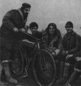— Нас было трое...— рассказал Вахомский, когда мы встретились у него дома. Он прдошел к старенькой этажерке, достал фотографию. На ней были сняты несколько демобилизованных командиров Красной Армии.— Вот этот, круглолицый, Вася Барболин. Мы втроем дружили... вместе заказали во Владивостоке три совершенно одинаковых паспорта-регистратора туриста, а позднее и — через акционерное общество — три одинаковых велосипеда фирмы «Принцетон». Но... поехал в путешествие Травин один...