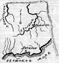 Необходимые доделки отняли всего лишь два дня. Небольшой правый приток Среднекана оказался не очень интересным в геологическом отношении и не дал ничего нового в смысле золотоносности. Пробы, которые одну за другой промывал Игнатьев, содержали редкие золотинки; их можно было считать всего лишь фоновой золотоносностью для этого района. Наконец и этот последний маршрут подошел к концу. Маленький отряд спустился в долину Среднекана, где пришлось заночевать. До базы оставался дневной переход.