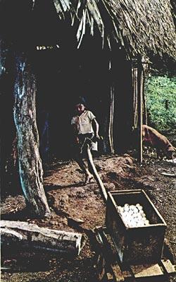 Я отправился вслед за процессией. Мы еще только приближались к ферме крестьянина, но на ее скотном дворе уже звучал целый хор голосов, который словно бы восхвалял всевышнего за ниспосланный завтрак. Когда же мальчонка принялся горстями швырять черепашьи яйца за невысокую загородку, свиньи, индюки, утки, куры так дружно набросились на эту трапезу, что буквально в считанные минуты на утоптанной земле остались лишь жалкие клочки кожистой скорлупы. Зрелище, надо признать, было не из приятных, но что поделаешь, если яйца тихоокеанской черепахи традиционно являются немаловажной составной частью местной экономики. С другой стороны, крестьяне никогда не причинят вреда взрослой черепахе, не говоря уже о том, чтобы пустить ее на бульон, ибо для них она служит куда более ценным источником калорийного корма для домашнего скота и птицы. Здравый практицизм здесь одерживает верх над гурманством.