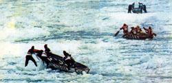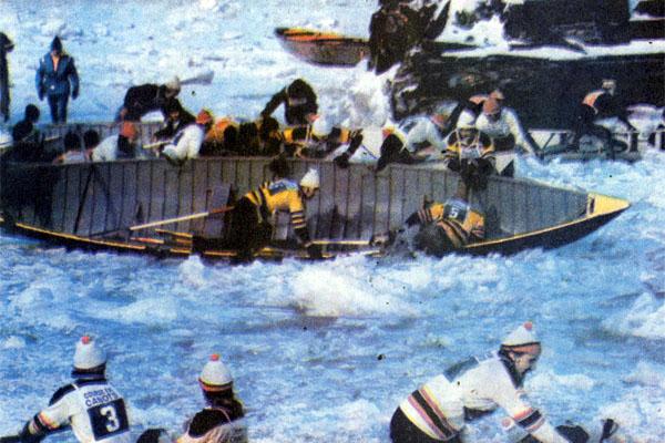 Правила соревнований достаточно просты: команда, которая сумеет первой пересечь туда и обратно реку Св. Лаврентия у городка Леви, неподалеку от Квебека, считается победительницей. На первый взгляд задача не столь уж трудная для пяти опытных гребцов, составляющих экипаж каноэ, ибо ширина реки в этом месте всего три четверти мили. Но, как полушутя-полусерьезно утверждают квебекцы, главное вовсе не в том, чтобы занять призовое место: возвращение к месту старта уже само по себе вполне заслуженная награда для спортсменов. Ведь в феврале, когда проводятся соревнования, 20-градусные морозы одевают реку Св. Лаврентия ледяным панцирем. И только посредине в результате совместных усилий океанских судов, поднимающихся к Монреалю, и прилива, дважды в сутки достигающего 6-футовой отметки, остается некое подобие чистой воды, по серо-свинцовой поверхности которой стремительно плывут большие льдины. Каноистам же во время соревнований, помимо этого адского крошева, нужно еще четыре раза преодолеть полосу берегового припая!..