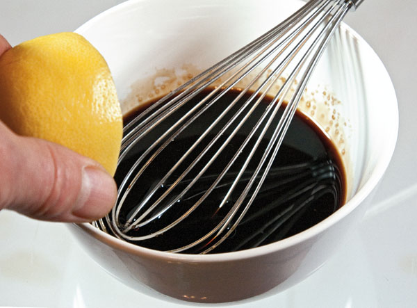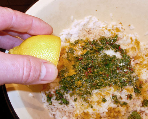 Теперь возьмем подходящую чашку, положим в нее перемолотый рис. Затем - оставшуюся часть отваренного риса. Затем - смолотую смесь кинзы, перца, чеснока и имбиря. Добавим две чайные ложки сахарного песка. Чайную ложку молотой куркумы. Две столовые ложки соевого соуса (или пару небольших щепоток соли). Выжмем сок половины лимона, а еще лучше - лайма.