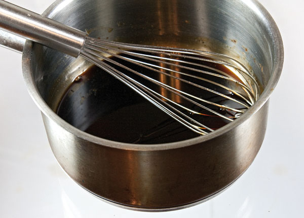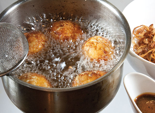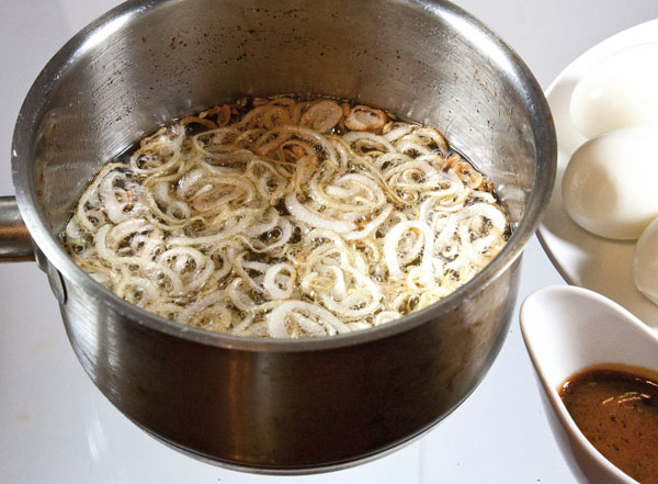 Соус отставим в сторону, дабы остывал, и займемся, собственно, обжарками. Вольем в подходящий ковш или сотейник такое количество растительного масла, чтобы при обжарке яиц масло прикрывало их хотя бы наполовину. Однако прежде мы обжарим не яйца, а нарезанный на тонкие колечки лук. В последующем обжаренный лук украсит блюдо, а его первоочередность в обжарке продиктована тем, чтобы вдобавок, придать маслу более изящный вкус. Лук обжариваем в хорошо прогретом масле до полного зарумянивания, выловив его потом ситечком или шумовкой и переложив на отдельную тарелку.