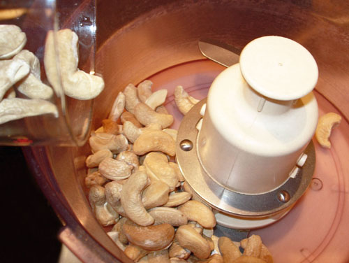 Затем возьмем примерно 100 граммов орешков кешью или арахиса или любых других, кроме кедровых, и измельчим их любым доступным способом, например, в кухонном процессоре. Это наша будущая панировка, поэтому до состояния пыли измельчать орешки не нужно.