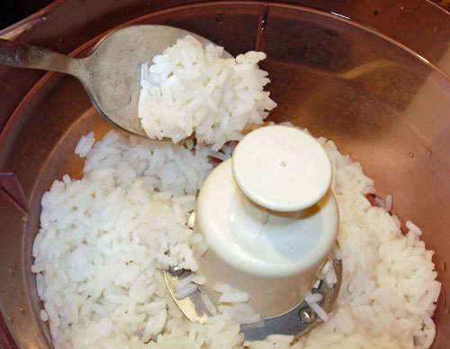 Вновь ополаскиваем процессор и закладываем в него примерно две трети от общего количества отваренного риса. И - перемалываем, причем добросовестно, в пастообразную субстанцию. Чем больше и тщательнее мы перемалываем, тем лучше потом будут лепиться пончики.