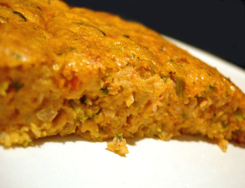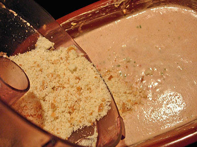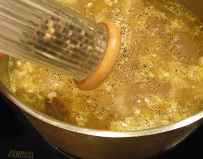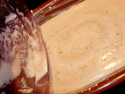 Затем включим комбайн на полную катушку - пусть себе перемалывает содержимое в жидкое пюре, а заодно и хорошенько взбивает яйца (чем дольше, тем лучше). Это нам очень и очень пригодится. А пока же разогреем духовку до 250 градусов и обильно смажем какую-нибудь подходящую форму или сковороду, способную держать духовочный жар, кусочком сливочного масла.