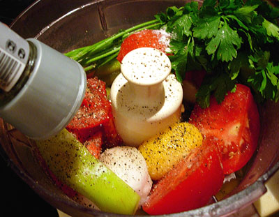 Нет, у нас абсолютно нет времени на нарезки, обжарки поджарки. Мы только с тобой помоем овощи, очистим их от ненужных шкурок, хвостиков и "попок" и сложим в кухонный комбайн, разбив в него же все четыре яйца, добавив щепоть соли и толику свежемолотого черного перца.