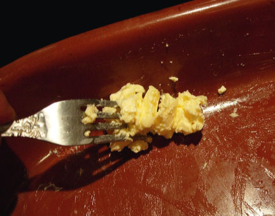Стоп-стоп-стоп. Вот ты говоришь, почему я не смолол эту осьмушку белого батона с яйцами и овощами. Да, мы ленивы. Да, нам надо быстро. Но ведь мы хотим получить воздушное и нежное суфле, а не кусок сухого пирога. Чтобы осьмушка нашего батона не превратилась в тесто, а потом и в кусок сухого пирога, мы и не стали перемалывать осьмушку с овощами, а перемололи отдельно. Но потом - соединили с яично-овощным пюре, перемешав его вилкой.