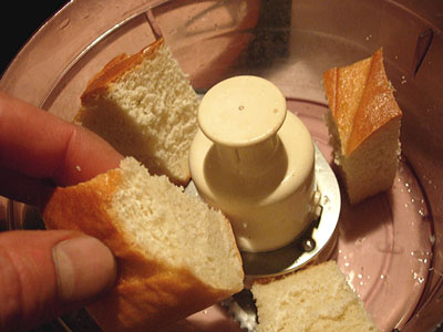 Ставить в духовку? Не будем торопиться. Коль уж мы отказались от яичницы с помидорами, нужна ли нам будет полужидкая яичная каша? Нет. Возьмем выше. Мы приготовим суфле. А для него нужна какая-то более плотная основа. Поэтому возьмем осьмушку белого батона, подсушим ее в тостере, разрежем на куски и так же отправим в кухонный комбайн.