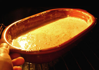 Однако минут через 20 проверяем, как запекается наше суфле. Его яркая румяная корочка - еще не показатель, что суфле готово в той консистенции, которое нам нужно. Мы похлопаем по поверхности шумовкой и если поверхность окажется не слишком упругой, проткнем суфле ножом. Так и есть, в суфле еще сохраняется жидкость. Поэтому мы подрумяним его еще, но до разумных пределов.