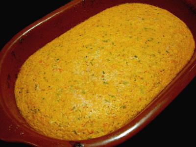 Да, смолотые комбайном овощи со взбитым яйцом имеют пока малопрезентабельный вид. Но это пока. Только пока. Памятуя об этом "пока" выльем образовавшееся пюре в смазанную маслом форму.