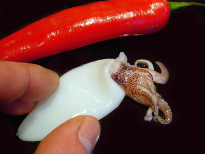 ...доводим его до кипения, добавляем обжаренных кальмаров и пряности: пару смолотых зерен гвоздики, несколько раздробленных горошин белого и черного перцев и щепотку соли.