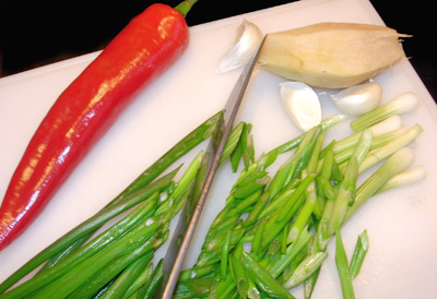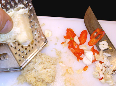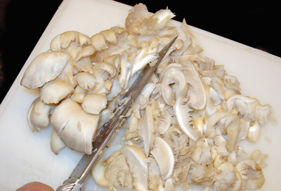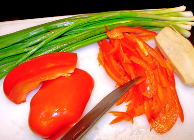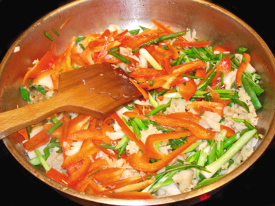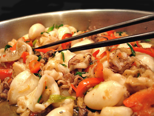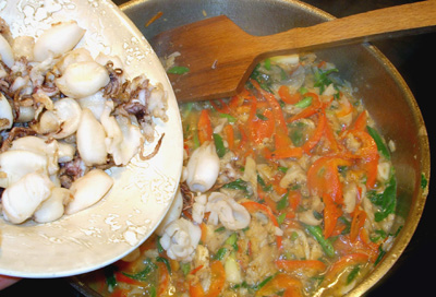 Слегка обжаренных кальмаров вынимаем из сковороды на отдельную тарелку. В остатки масла, в котором жарились кальмары, добавляем нарезанные овощи, вешенки и тертый имбирь. Быстро перешивая, обжариваем смесь так же не более 3-4 минут.