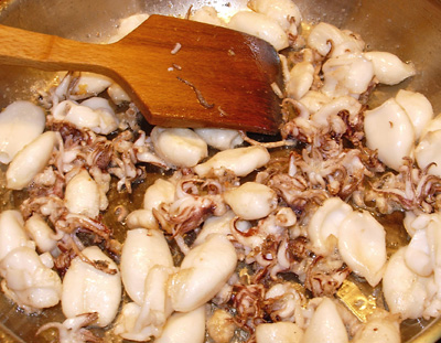 Ну вот, подготовительные работы закончены, можно браться и за дело. Сильно разогреваем в сковороде граммов 50 оливкового масла и начинаем быстро обжаривать кальмаров - не более 3-4 минут. Чем дольше кальмары жарятся, тем жестче они становятся. Поэтому скорость здесь работает на нас.