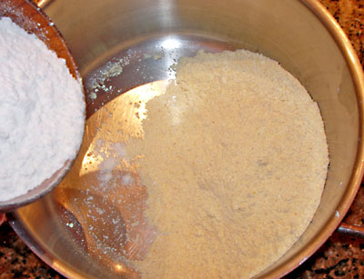 К полученной таким образом нутовой муке грубого (то есть, наиболее предпочтительного) помола можно теперь добавить такое же количество муки пшеничной, тоже грубого (и тоженаиболее предпочтительного) помола. Вот так: