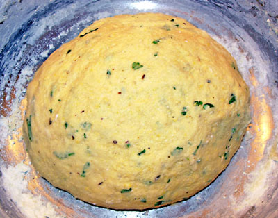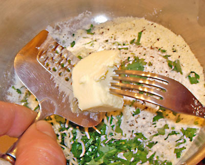 Теперь в смесь муки двух помолов можно добавить щепоть соли, щепоть растертой в ладонях зиры, щепоть свежесмолотого черного перца, столовую ложку мелко нарубленной кинзы и настрогать примерно две чайные ложки сливочного масла. Вот таким образом: