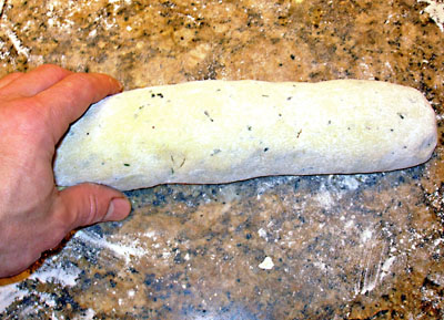 Затем тесто надобно с чувством, толком и расстановкой умять так, как я уже неоднократно советовал, ибо именно от этого зависит "воздушность" будущих лепешек. Умяв, дать тесту «отдохнуть», то есть расстояться в течение 15 минут, затем скатать из него брусок, не забыв посыпать рабочую поверхность стола мукой.