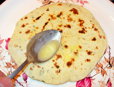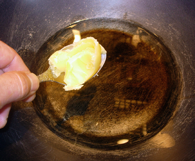 Теперь в обширной сковороде, стальной кастрюле, в воке или казане слегка разогреваем 100 граммов растительного масла и добавляем в него ложку топленого или сливочного (стопроцентные вегетарианцы могут обойтись и без этого).