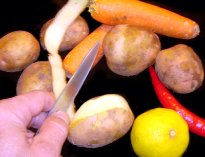 Но сначала почистим пять шесть средних картофелин и две средние моркови.
