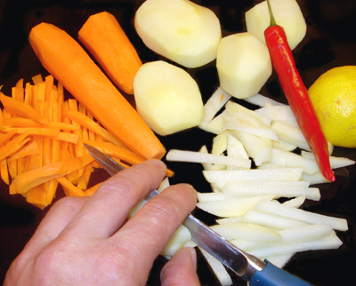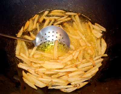 Надеюсь, друзья мои, теперь вам понятна роль моркови в этом блюде, почему она не смешивается с картофелем и почему обжаривается перед картофелем, а не наоборот. Морковь ароматизирует фритюр, готовя его, так сказать, для картофеля. Но смешивать во время жарки эти овощи нежелательно еще и потому, что у них разное время, для того, чтобы дойти до нужной готовности.