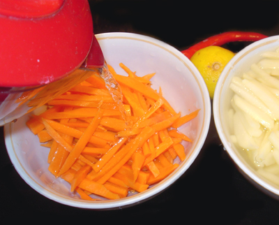 Сложим нарезанные овощи по отдельным глубоким тарелкам или мискам и на 30 минут зальем их ледяной водой (если таковой нет, можно добавить по несколько кубиков льда).