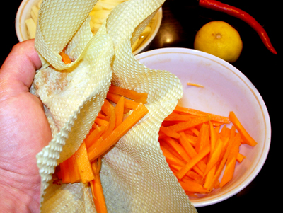 Мудреный ход, ничего не скажешь. Вот она - эмпирика тысячелетий, отвергающая фастфудовский прогресс! Охладить, не разрушая клетчатки овощей и навострить те же овощи на румяную и аппетитную корочку во фритюре. Полагаю, в седой древности мало разбирались в клетчатках или ее роли в процессах метаболизма или, проще, усваиваемости пищи, которая должна идти на пользу организму, а не собираться в жиры. Тогда больше заботились о сохранении вкусовых качеств продукта, которые обеспечивает и сохраненная же клетчатка. Ну, а смысл трюка в сторону аппетитности и так понятен: поверхность кусочков охлаждена а, стало быть, попав во фритюр, такой кусочек будет зарумяниваться медленнее "теплого" кусочка, позволяя дойти до кондиции сердцевине продукта. Хорошо, но почему овощи замачивается в отдельных мисках? Погодите, доберемся и до этого. А пока же, выдержав овощи указанное время в воде, воду сливаем и обсушиваем, не перемешивая, наши кусочки бумажной салфеткой. Чтобы не брызгался фритюр.
