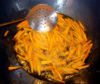 Еще больше прогреваем масло и начинаем обжаривать в нем соломку моркови.