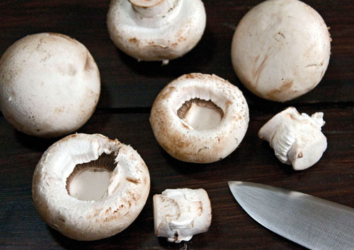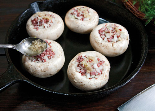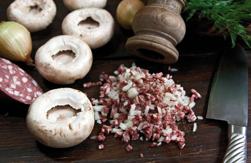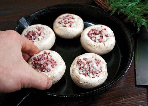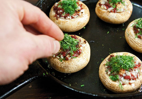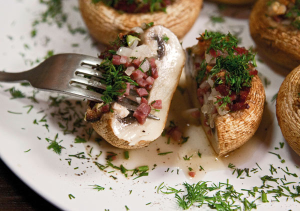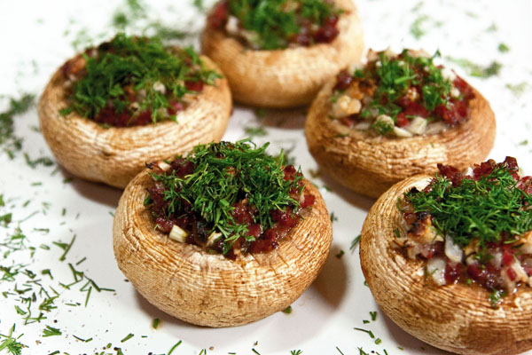 А теперь, друзья мои, внимание! От того, насколько правильно мы выдержим шампиньоны в духовке, зависит и успех нашего мероприятия. Итак, поначалу шампиньоны должны запекаться ближе к верху духовки, но строго до того момента, пока не начнет зарумяниваться начинка. Как только это произойдет, температуру в духовке нужно будет сбросить до 150 градусов и переместить посуду с шампиньонами в самый низ духовки. Начнется обильное выделение сока из шампиньонов и начинки, который доведет до готовности сами грибы. Запекать шампиньоны следует недолго, еще минут 15 после перемещения посуды. За минуту до полной готовности поверх начинки желательно положить рубленую зелень, чтобы она хорошо прогрелась и полнее раскрылась по части аромата.