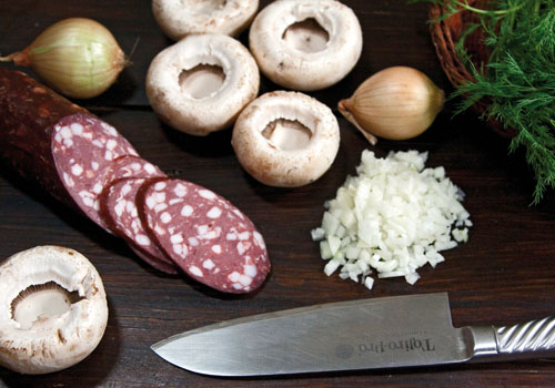 Конечно, если нет достаточной сноровки, порубить овощи, грибы и яйца можно заранее, как, впрочем, и обжарить. Ибо за главным действующим "лицом" нашей закуски - цукиниевыми лотками - нужно все же присматривать, чтобы они не разварились и, соответственно не развалились. Ведь именно в такие, достаточно крепкие лоточки нам предстоит заложить сначала обжаренную смесь лука и грибов...