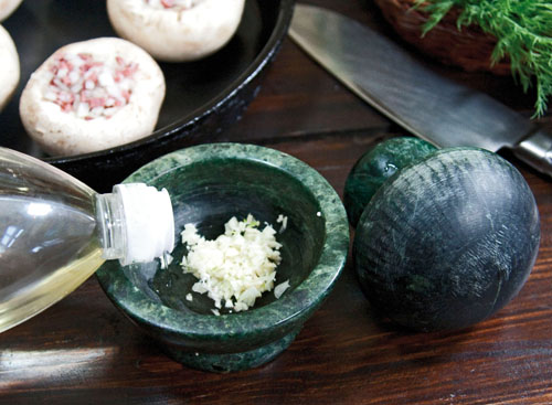 Отставляем посуду в сторону и продолжаем готовить начинку, но уже примерно такую, какую французы добавляют при приготовлении эскарго - печеных виноградных улиток. Для начала растираем в ступке или измельчаем в блендере пару зубчиков чеснока и добавляем в растертый чеснок пару ложек растительного масла.