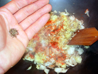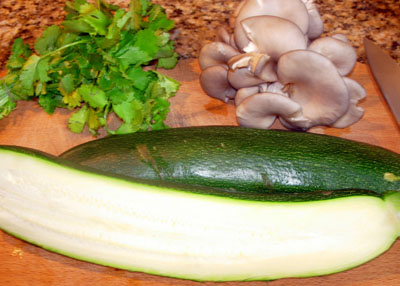 В подходящей сковородке разогреваем немного растительного масла и быстро, до полуготовности (те же 5-7 минут), обжариваем в нем смесь из грибов, лука и мякоти цукини, не забыв слегка подсолить, поперчить и добавить пряностей (я всыпал щепотку смеси средиземноморского аниса и семян кориандра)