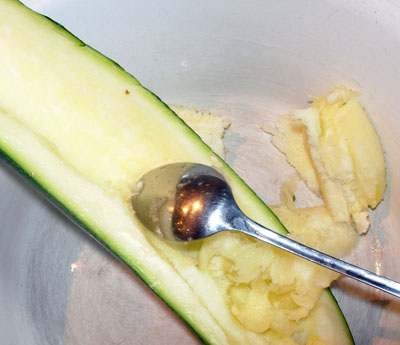 Затем столь же аккуратно вычистим мякоть из половинок цукини в отдельную миску. Лучше всего это сделать чайной ложкой.