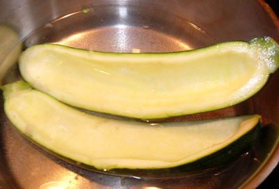 Теперь получившиеся из половинок цукини лоточки нужно отварить до полуготовности в кастрюле с кипящей водой - примерно 5-7 минут. Кастрюлю нужно взять побольше, чтобы не заламывать лотки.