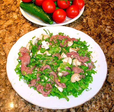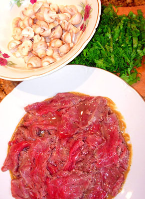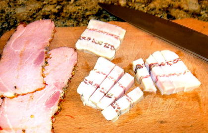 1.Берем граммов 50 свиного сала с мясными прожилками и граммов 30-40 любой ветчины и произвольными кубиками все это дело нарезаем.