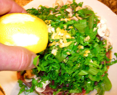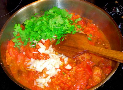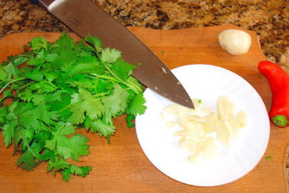 4. Особо не выпаривая появившийся от помидоров сок, мелко крошим 2-3 зубчика чеснока и тщательно перемешиваем чеснок с парой щепоток соли, держа наготове несколько веточек любой зелени и красного перца (по желанию).