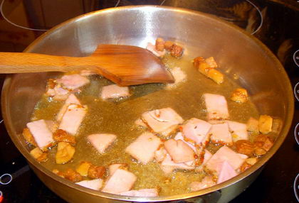 2. Сначала растапливаем и обжариваем кусочки сала так, чтобы с них максимально ушел в сковороду жир, а затем добавляем кусочки ветчины.