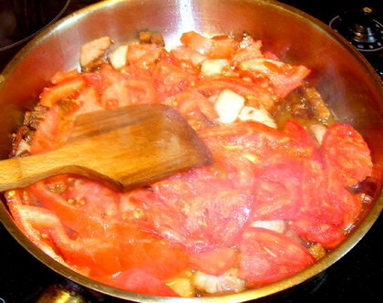 3.Ставим на разогрев духовку, а затем, произвольно нарезав 2-3 помидора, обжариваем помидорные кусочки с салом и ветчиной.