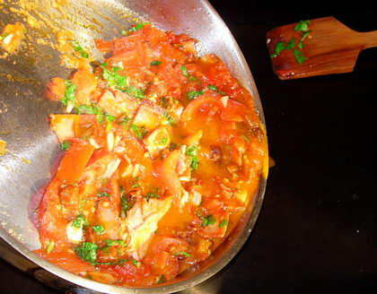 5.Чеснок, растертый с солью, мелко нарубленную зелень и перец добавляем в помидоры, оставляя все это тушиться на медленном огне, поскольку нам нужно за это время очистить пять-шесть средних картофельных клубней.