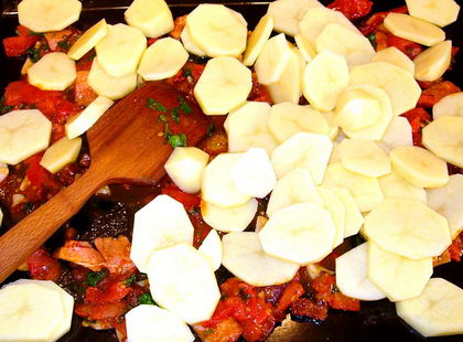 7…добавить нарезанный кружками картофель и, все перемешав, равномерно распределить по противню картофельно-помидорно-ветчинную смесь.