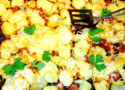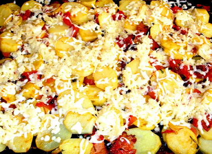 8. Как говорится, алес! Противень в духовку минут на 15 и, как только картофель слегка зазолотится, вынимаем противень из духовки, посыпаем поверхность нашего блюда 100 граммами любого натертого сыра и загоняем противень в духовку вновь, не забыв убавить температуру до 150 градусов.