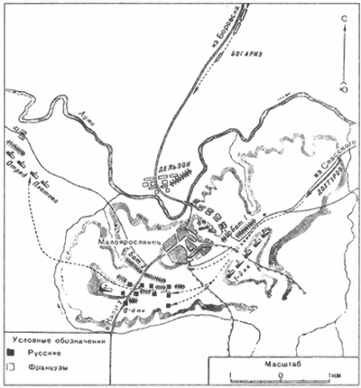 Несмотря на трудности марша по труднопроходимым дорогам, размокшим от недавних дождей, артиллерия успешно подошла к Малоярославцу вместе с пехотой и конницей.